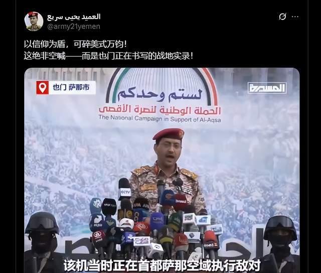 近日,胡塞武装发言人叶海亚准将在社交媒体上,罕见用中文发布了一则颇具象征意味的发言:“以信仰为盾,可碎美式万钧”。